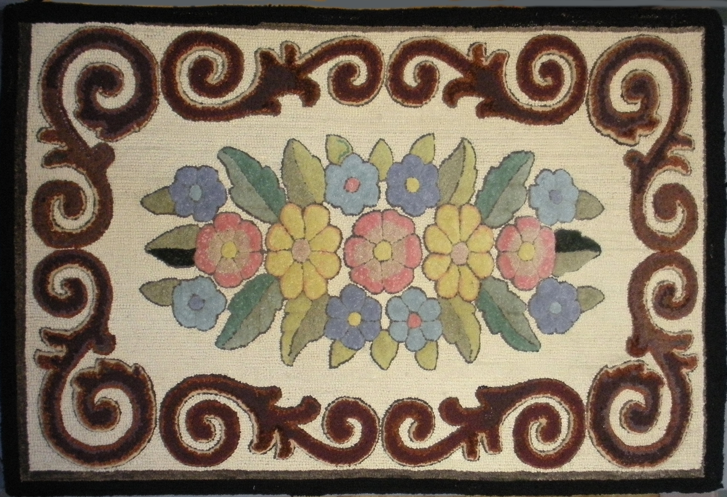 This mat, made for sale, makes interesting use of sculpted floral and scroll elements which requires careful hooking.