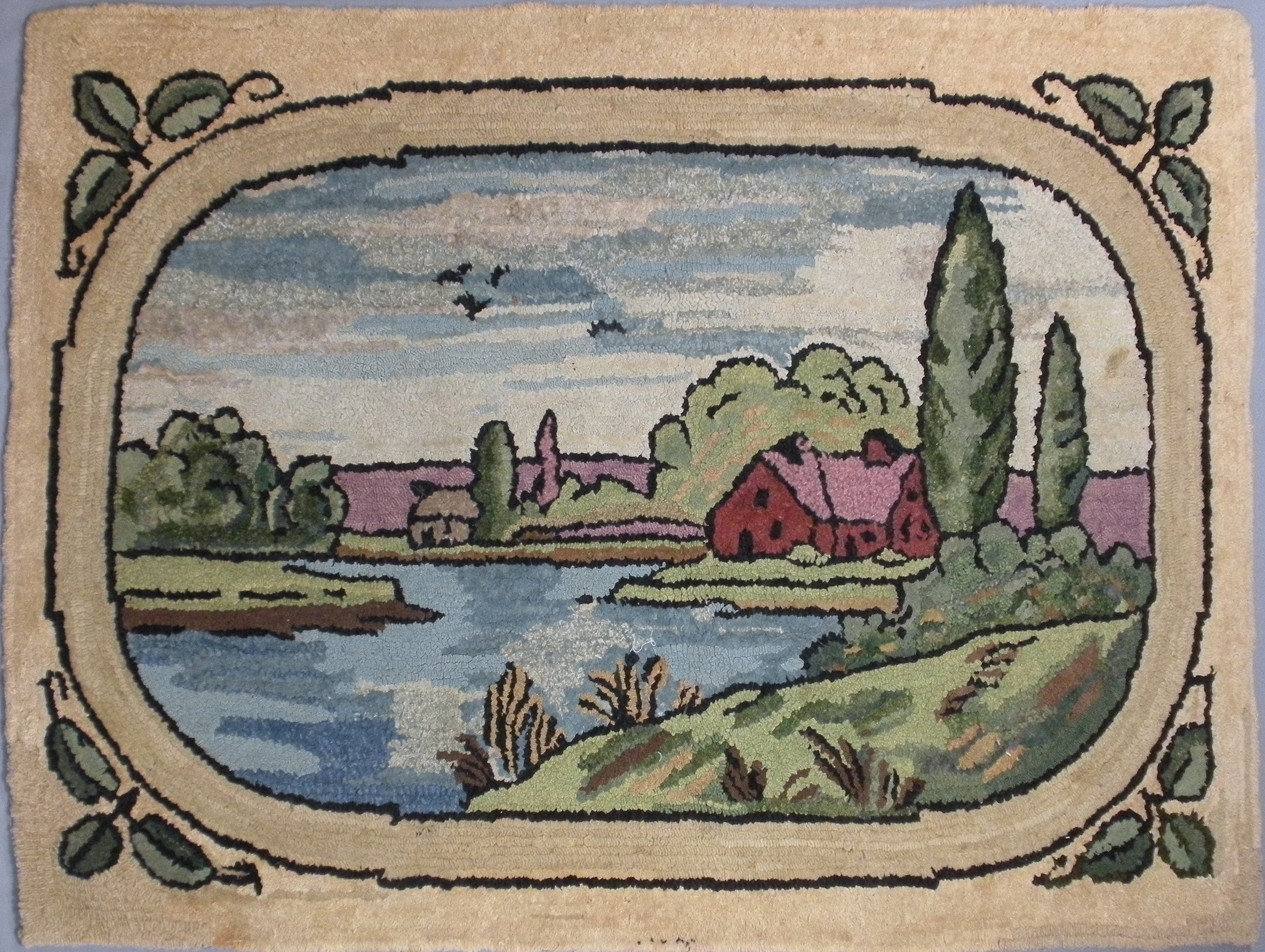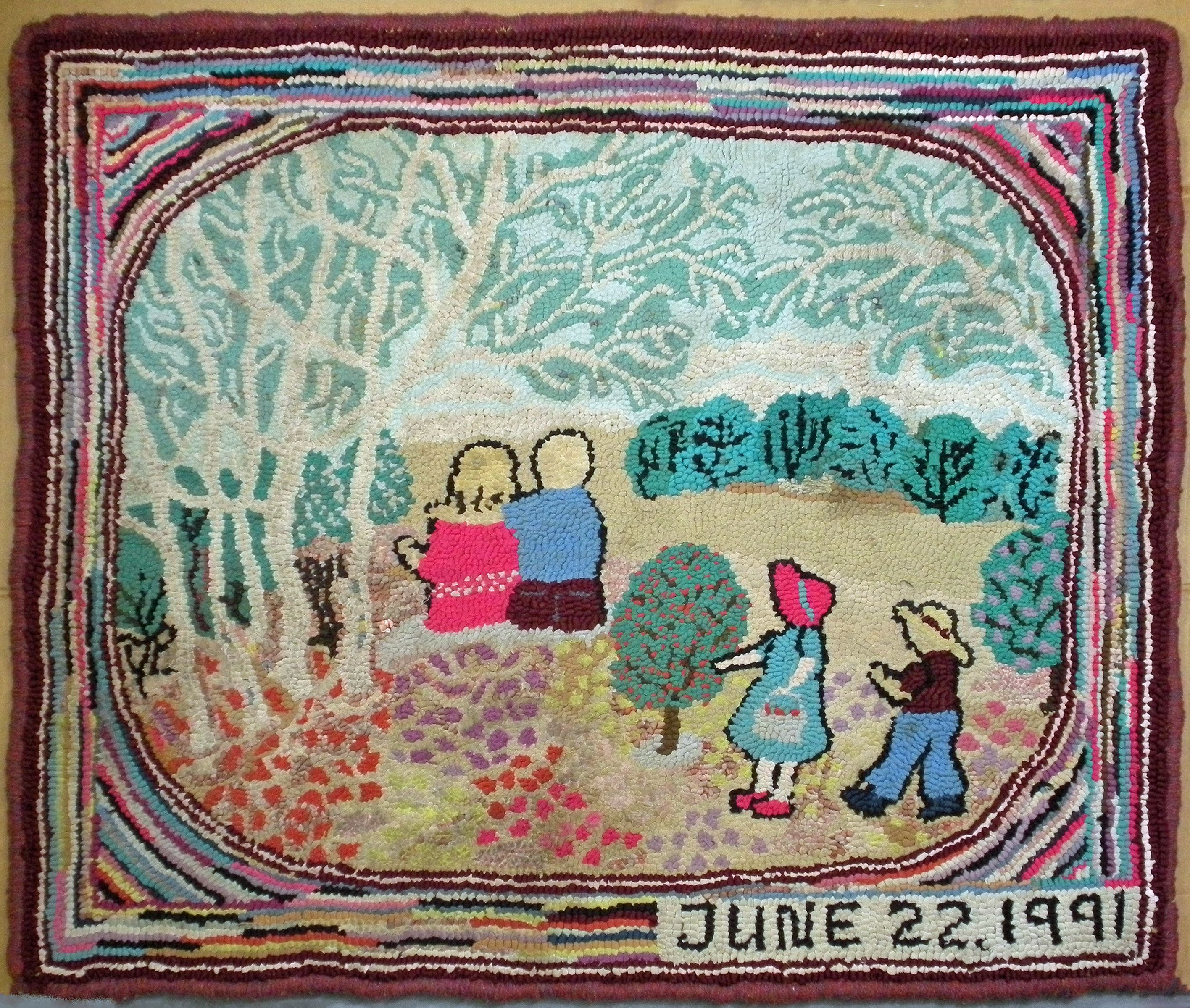 The maker was taught to hook by her mother, Bessie Roberts, and made her first mat at age nine. In addition to making mats for home use, in her later years she made them to commemorate family events such as the birth of a great‑grandchild. The original design of this mat is charming for its effective combination of outline and fill for the figures, the free‑form landscape as well as the "Hit or Miss" border.