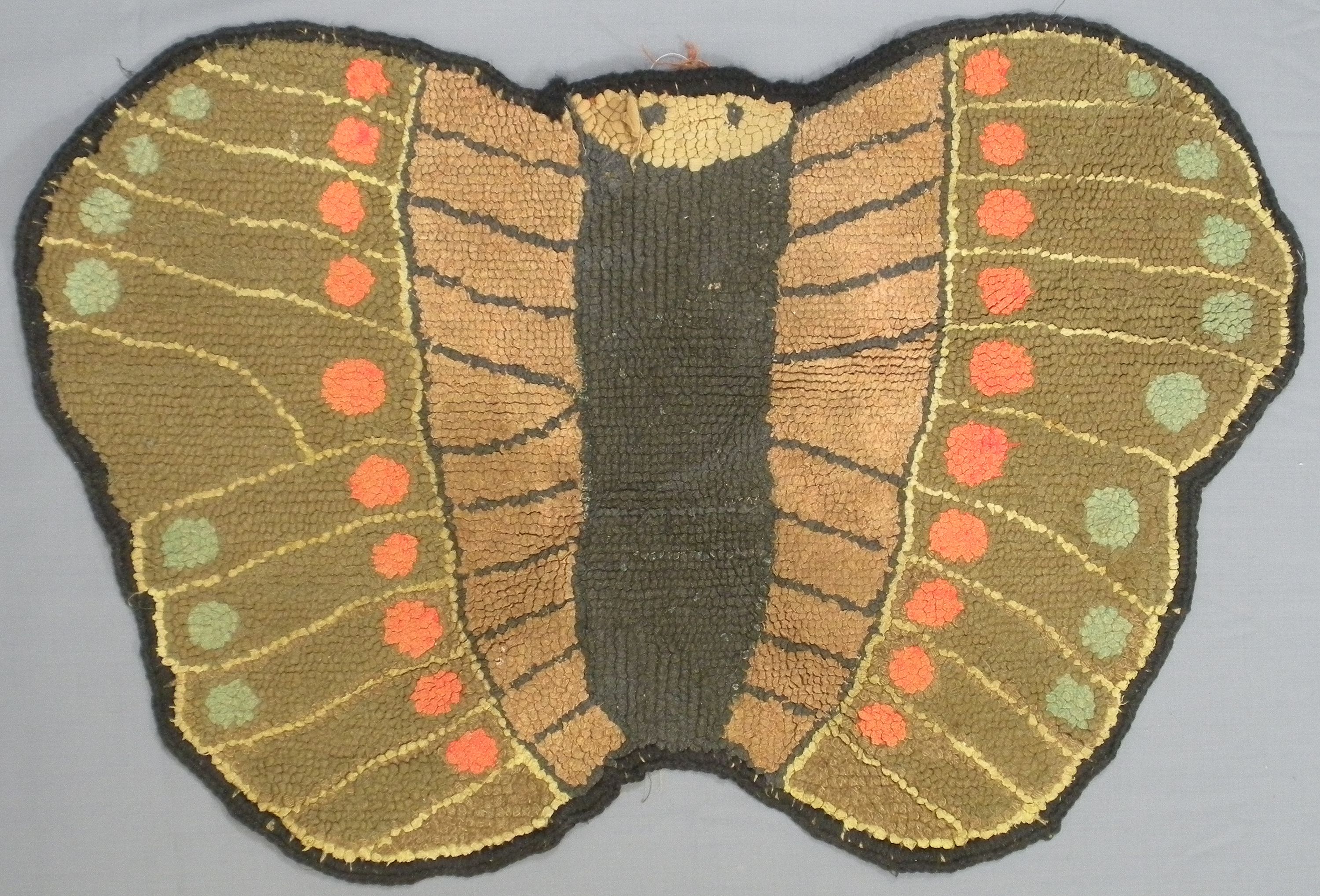 This whimsical butterfly is an unusual "shaped" mat and original design. The discrepancies of symmetry and the muted tones add to its charm. While raising ten children, the maker also managed to make mats for sale or in exchange bartered with travelling pedlars.
