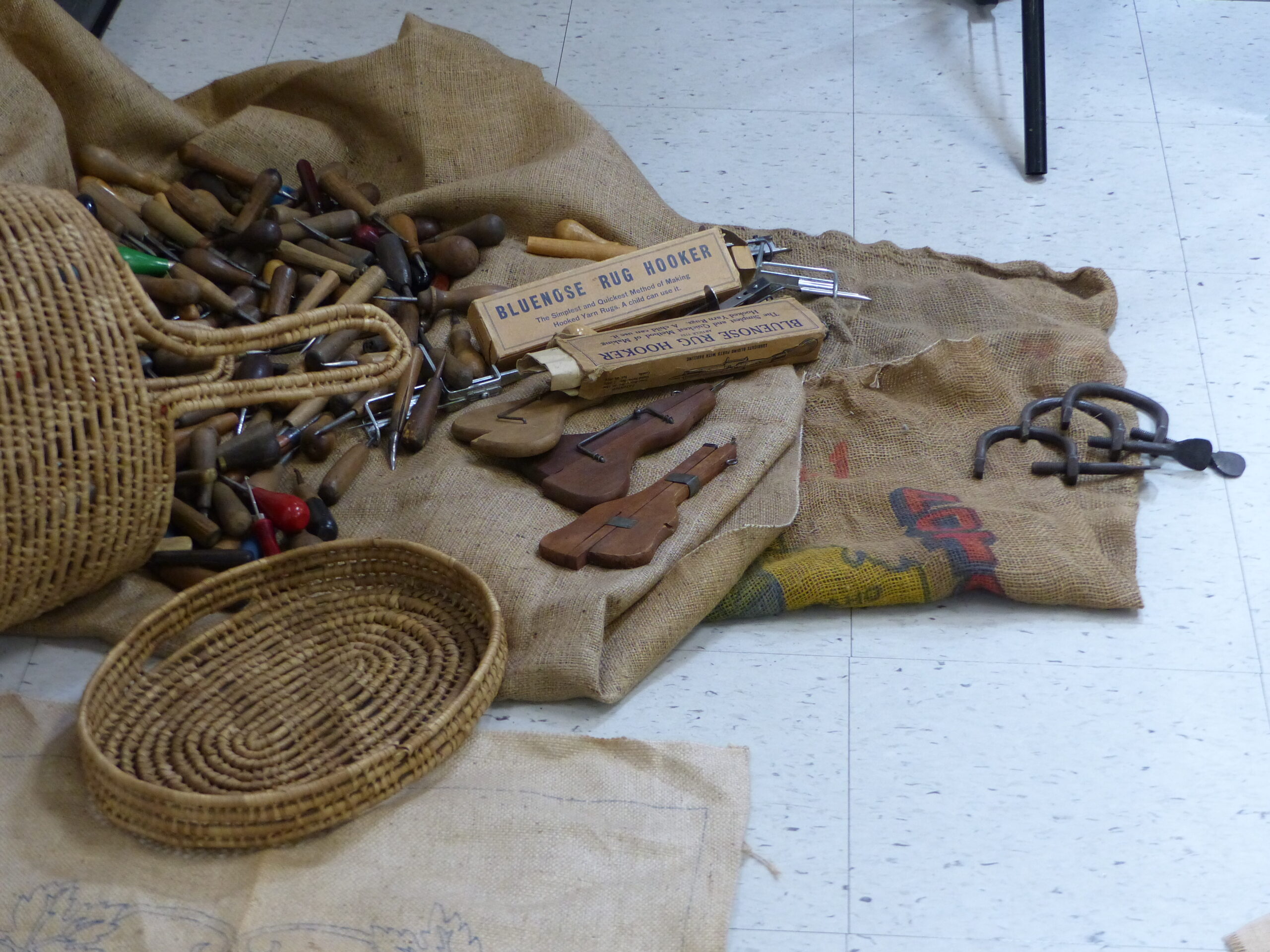 Jute also played a role as a hooking material, since Canadian makers would unravel the burlap sack strand by strand, sometimes dye them and then hook them into a mat.