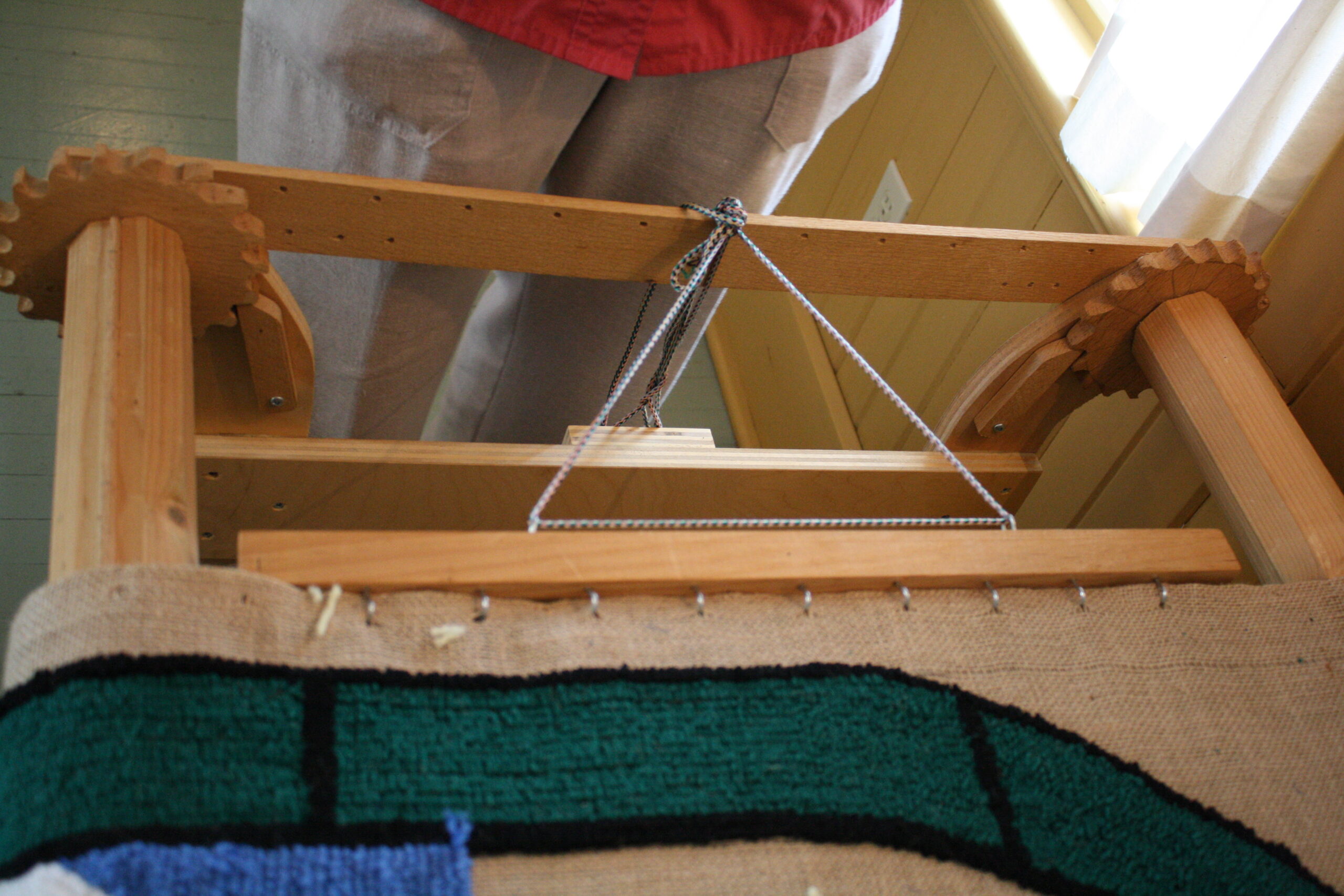 Over the decades, more frame designs became available. The Cheticamp-type frame is a floor frame. Two sets of legs hold two rollers that can be adjusted to make the backing taut. If the mat is longer than the frame, the hooker can start hooking at the bottom, move the rollers up, and continue hooking the mat one section at a time. This type of frame is still widely used and available.