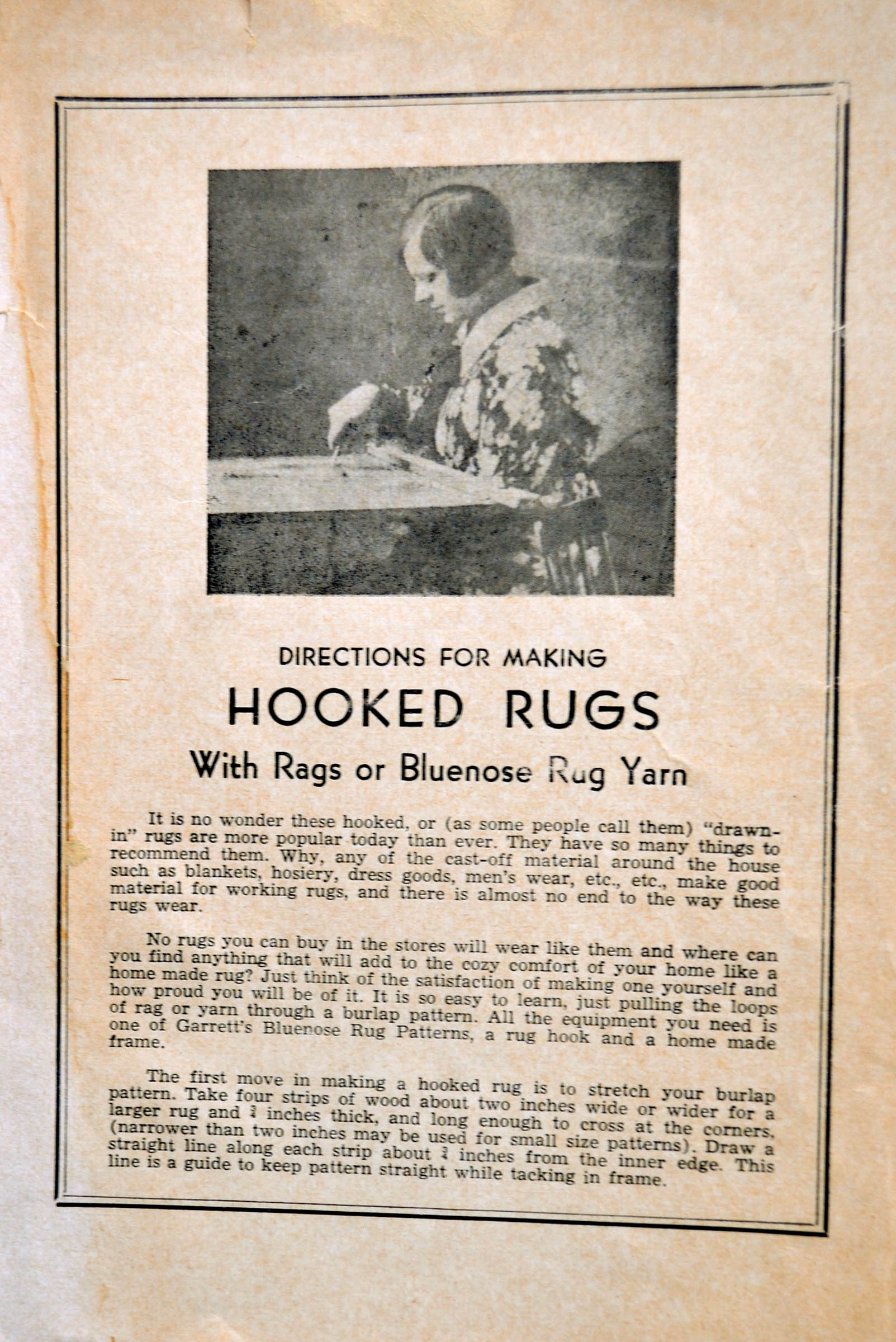 Bluenose schooner series, and would go on to form a limited company with his three sons, where they would also hook and sell mats. They eventually hooked with the wool they processed and dyed in a mill they had acquired to ensure a constant supply of wool. They had 18 women painting the pattern colours as inspiration onto the burlap with mixtures they made themselves from Diamond Dyes. Over the years, they produced over 400 mat designs and had a mailing list of 20 000 women’s names. After a decline in hooking and a fire at their shop, the Garrett’s closed their doors in 1975.