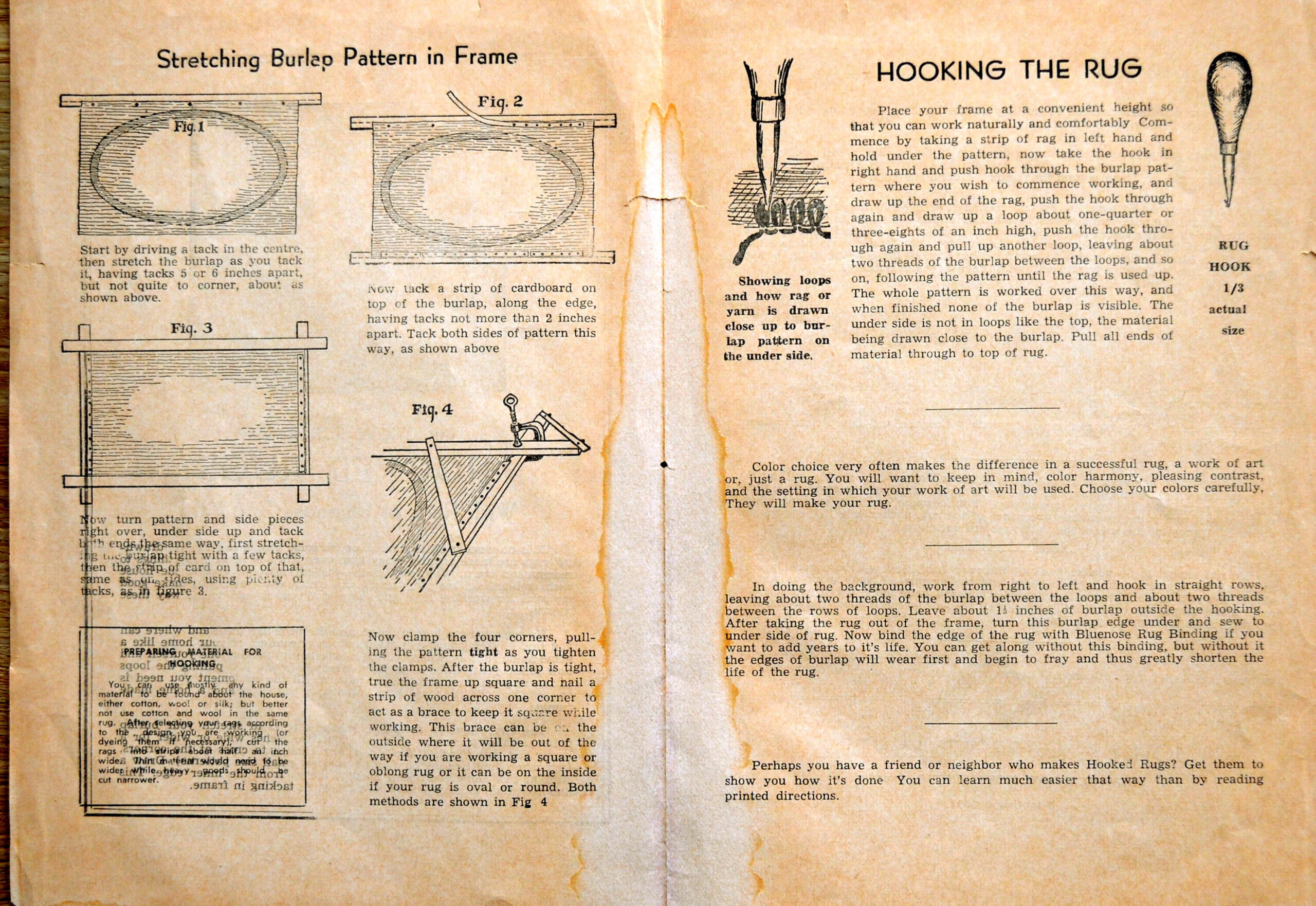 Though linen textile was available in New Brunswick and Canada, it only became a popular backing much later, when monk’s cloth, a more loosely woven version, became available. Many hookers now choose it or cotton monk’s cloth, either for durability or because they don’t produce as much dust as the traditional burlap, but the burlap hasn’t lost its status as the workhorse of mat backing. Many commercial patterns are still printed on burlap. Other backings include rug warp, a heavier cotton cloth with less stretch than monk’s cloth, often used for punch hooking.