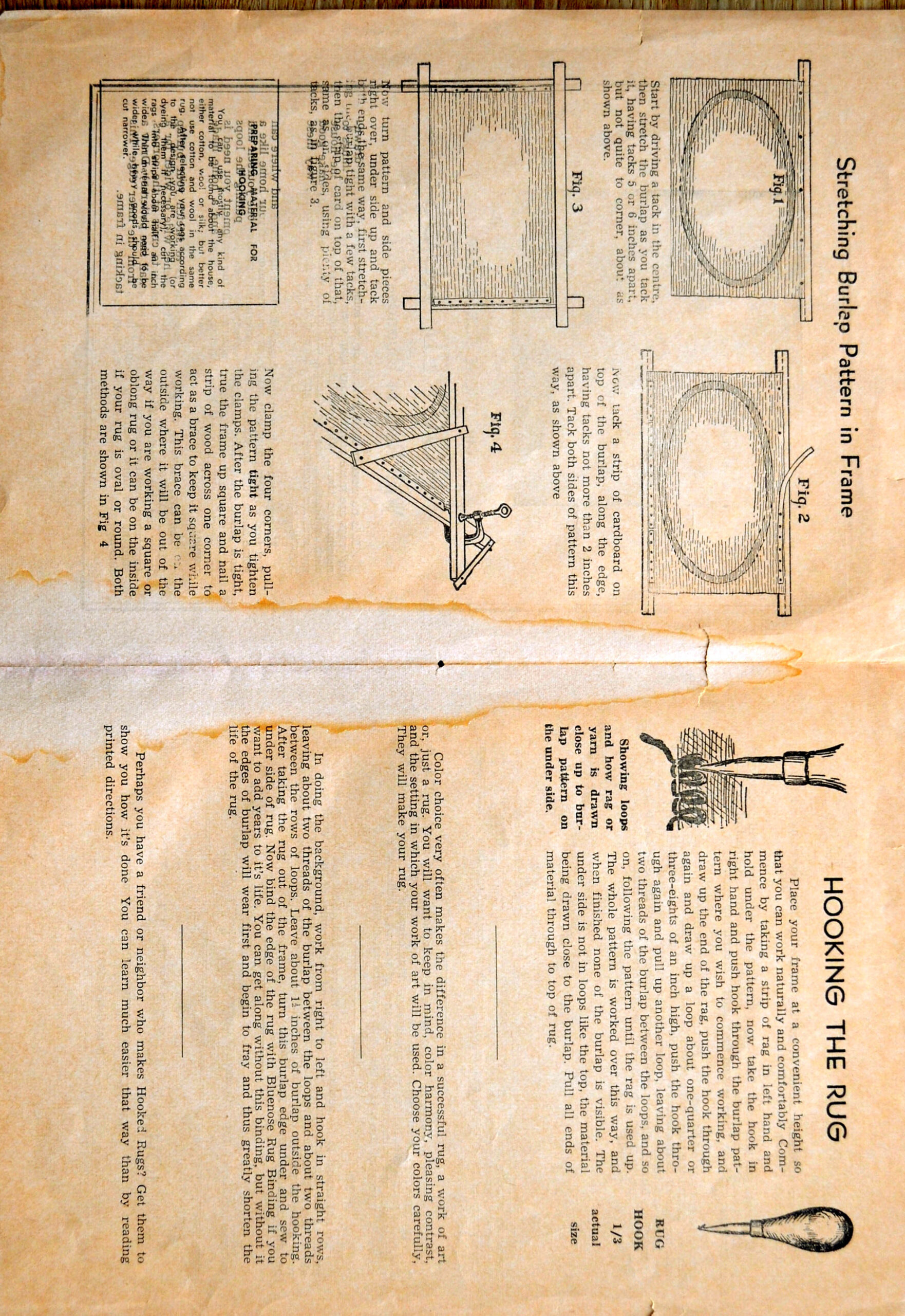 Early mat hookers might use homespun linen or canvas, though the tighter weave would have made it hard to pull rag strips through it. Traditionally, the most common backing has been burlap (also known as hessian), a woven textile made of jute. Burlap, originally produced in India, was exported in massive quantities to the West beginning in the late 1700s. Once burlap was introduced and widely available in North America, around 1850, hookers had a material they could afford and work with happily. The more modest households would have had access to burlap through the bags or sacks used to store and transport livestock feed or even potato bags. This form of burlap was always available, especially so during the First World War,